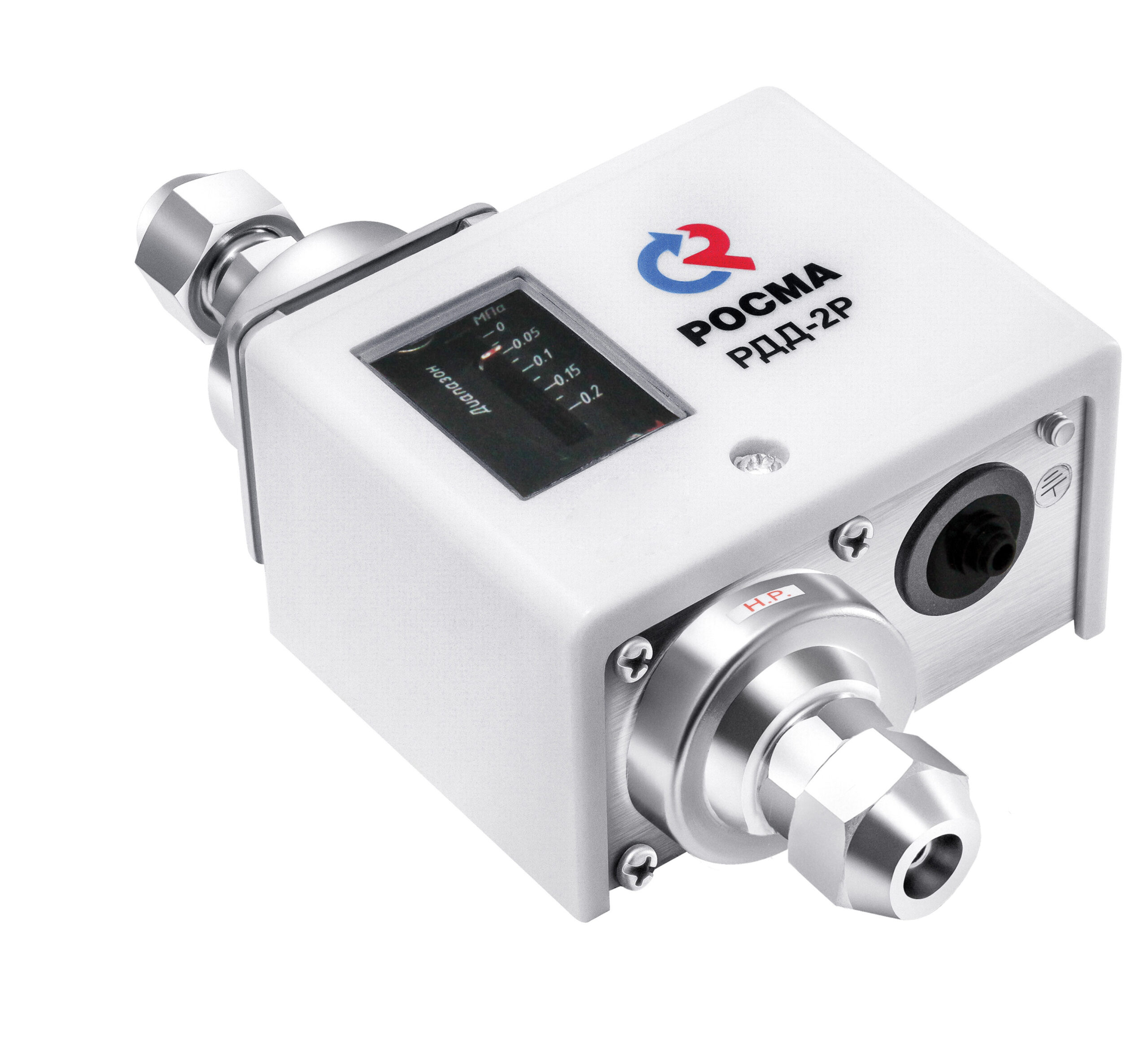 Тип РДД-2Р. Дифференциальные реле давления РДД предназначены для коммутации электрических цепей в зависимости от изменения разности двух давлений неагрессивных к медным сплавам жидких и газообразных, не вязких и не кристаллизующихся сред. Максимальная температура измеряемой среды (воздух, масло, вода, хладоны) – 110 °C. Принцип действия реле разности давлений состоит в сравнении двух давлений, подаваемых с двух сторон на сильфон, который деформируясь переключает однополюсный перекидной контакт. Основными параметрами реле перепада давлений выступают диапазон измеряемой разности давления, фиксированный дифференциал, а также максимальное статическое давление на входе прибора.