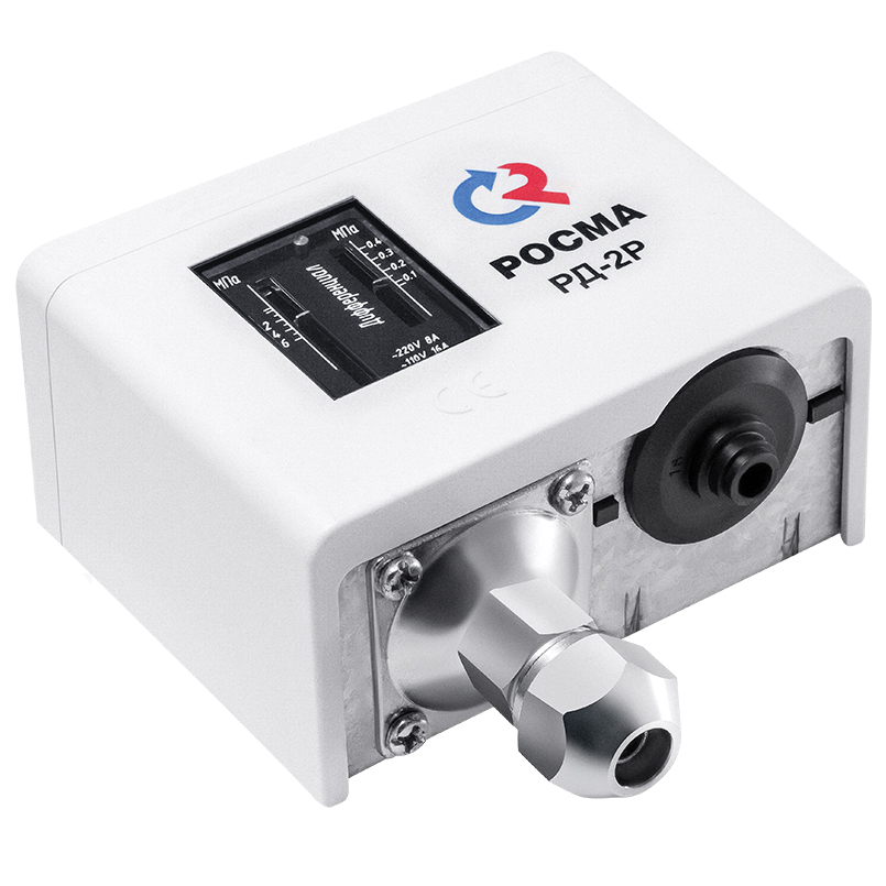 Тип РД-2Р, РД-2Р модель 35. Реле давления или прессостат применяется для переключения электрических цепей в зависимости от изменения давления среды. Это должны быть неагрессивные к медным сплавам жидкие или газообразные, не вязкие и не кристаллизующиеся среды с максимальной температурой до 110 °C (воздух, масло, вода, хладоны). Принцип работы реле заключается в следующем: когда значение давления в системе достигает определенной уставки, заданной заранее, происходит переключение однополюсного перекидного контакта. И затем реле срабатывает, замыкая или размыкая электрическую цепь. В момент, когда давление изменяется на величину настраиваемого дифференциала, реле возвращает контакт в исходное положение. Реле давления относится к категории автоматических устройств. Универсальность прибора заключается в возможности работать как при повышении, так и при понижении давления.