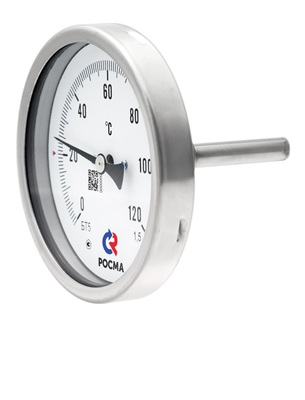 Тип БТ, серия 220. Биметаллический коррозионностойкий термометр с осевым присоединением и резьбой на штоке. Предназначен для измерения температуры агрессивных жидкостей и газов. Принцип действия термометров БТ основан на зависимости деформации чувствительного элемента от измеряемой температуры. В качестве такого элемента используется биметаллическая пружина. Она изготавливается из двух прочно соединенных металлических пластин, имеющих различные температурные коэффициенты линейного расширения. При изменении температуры пружина изгибается и вращает стрелку. Один конец пружины закреплен внутри штока, а к другому присоединяется ось стрелки. Корпус и шток коррозионностойкого термометра изготовлены из нержавеющей стали. Возможна комплектация термометра гильзой из нержавеющей стали с давлением до 25 МПа или до 60 МПа.