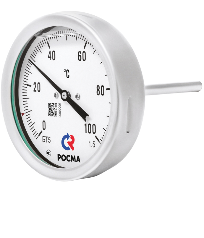 Тип БТ, серия 220. Коррозионностойкий термометр с осевым присоединением и резьбой на штоке. Предназначен для измерения температуры агрессивных жидкостей и газов. Принцип действия термометров БТ основан на зависимости деформации чувствительного элемента от измеряемой температуры. В качестве чувствительного элемента используется биметаллическая пружина. Биметаллическая пружина изготавливается из двух прочно соединенных металлических пластин, имеющих различные температурные коэффициенты линейного расширения. При изменении температуры пружина изгибается и вращает стрелку термометра. Один конец пружины закреплен внутри штока, а к другому присоединяется ось стрелки. Корпус и шток коррозионностойкого термометра изготовлены из нержавеющей стали. Возможна комплектация термометра гильзой из нержавеющей стали с давлением до 25 МПа или до 60 МПа. Прибор поставляется «сухой» (готовый к гидрозаполнению) или заполненный силиконом по требованию заказчика. Гидрозаполнение возможно только для БТ с диапазоном показаний температур до 250 °С.